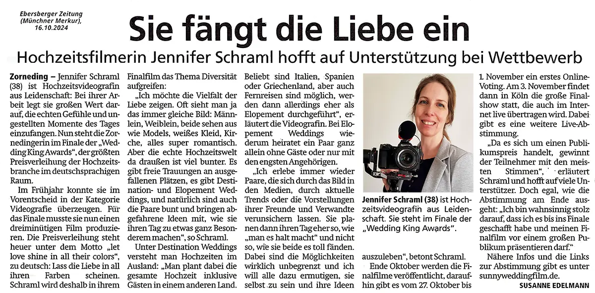 Die Teilnahme an den Wedding King Awards erregte auch mediales Interesse in der Region. Die Ebersberger Zeitung und der Münchner Merkur berichteten bereits zum Vorentscheid ausführlich über meine Nominierung für den renommierten Hochzeitspreis. In zwei persönlichen Interviews durfte ich der Journalistin Susanne Edelmann meine Leidenschaft für emotionale Hochzeitsfilme näherbringen. Für diese einfühlsame journalistische Begleitung meines Weges möchte ich mich herzlich bei ihr bedanken. Der Artikel vom 16. Oktober 2024 im Münchner Merkur kurz vor dem großen Finale war dann noch einmal ein besonderes Highlight.Unvergessliche Momente